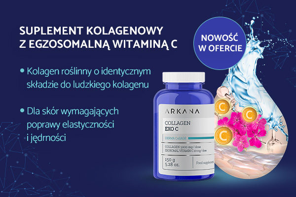 Collagen Exo C to nutrisuplement w formie proszku do rozpuszczania w wodzie. Wspiera syntezę kolagenu, dostarczając innowacyjną formę kolagenu human-like – wzorowanego na ludzki. Ponadto, dzięki zawartości egzosomalnej witaminy C, stymuluje syntezę kwasu hialuronowego oraz wspiera system antyoksydacyjny komórek.
